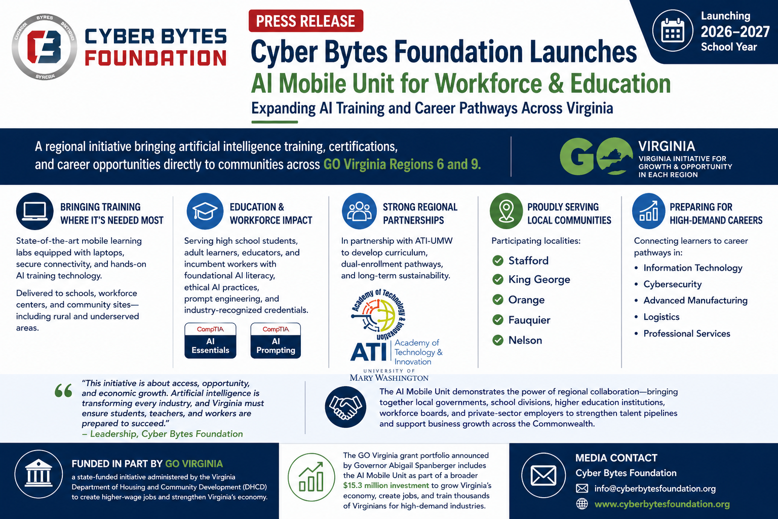 The Cyber Bytes Foundation 501(c)(3) mission is to establish and sustain a unique cyber ecosystem to produce the education, innovation, and outreach programs to enhance developers and the cyber workforce.